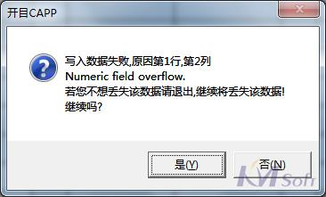在KMCAPP網(wǎng)格中導入EXCEL表格數(shù)據(jù)時,報錯“寫入數(shù)據(jù)失敗,原因第1行,第2列Numeric fieldoverflow.若您不想丟失該數(shù)據(jù)請退出,繼續(xù)將丟失該數(shù)據(jù)。繼續(xù)嗎?”如圖