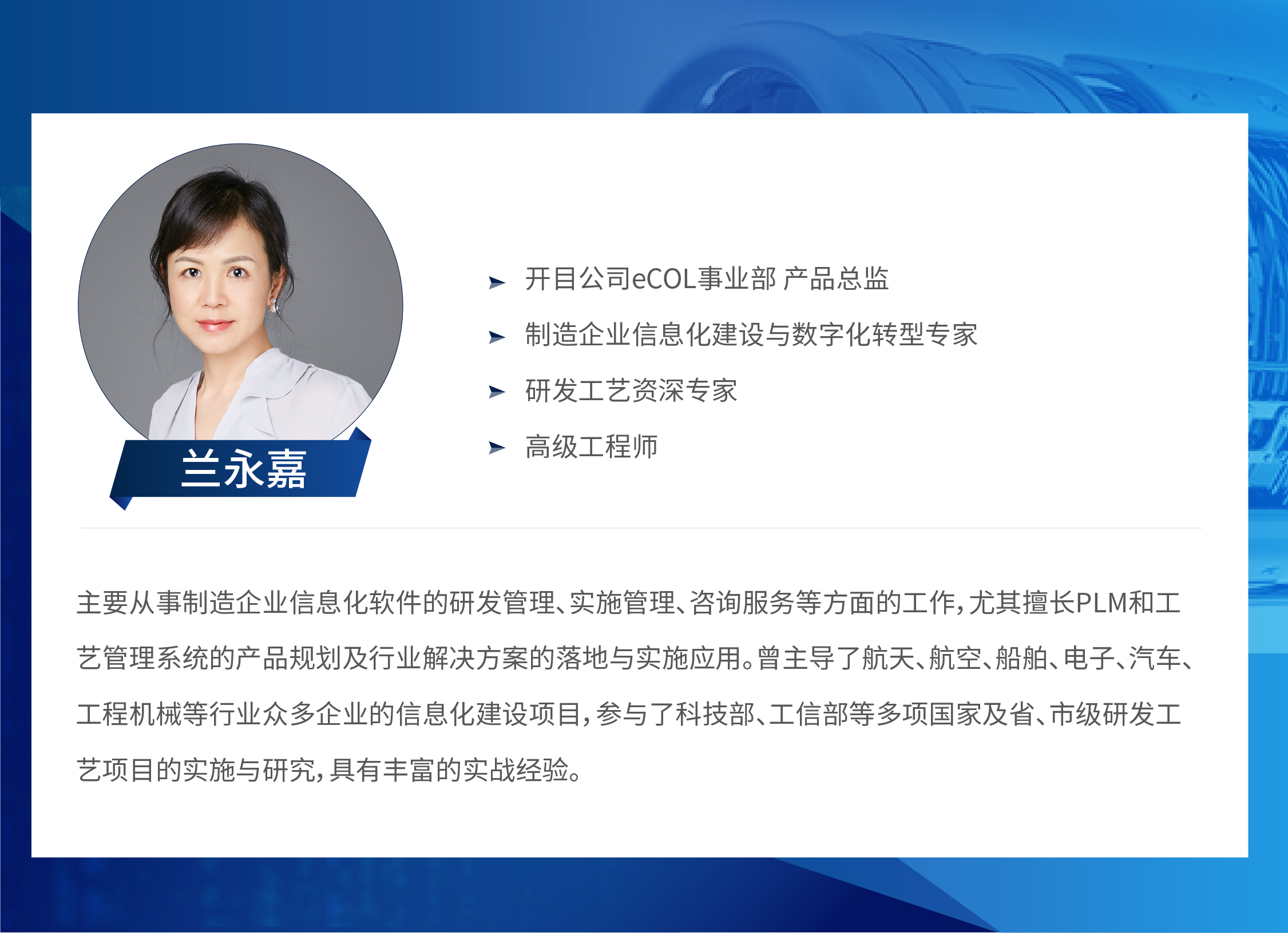 本期研討會(huì)特邀開(kāi)目公司eCOL事業(yè)部產(chǎn)品總監(jiān)蘭永嘉女士、東風(fēng)德納車橋有限公司制造信息化專家趙中軍先生、高德紅外工藝信息化專家施群先生做客開(kāi)目線上直播間,專家將全程在線答疑,與來(lái)賓深入探討開(kāi)目“研發(fā)工藝協(xié)同”的優(yōu)勢(shì)特點(diǎn)與實(shí)際落地應(yīng)用。