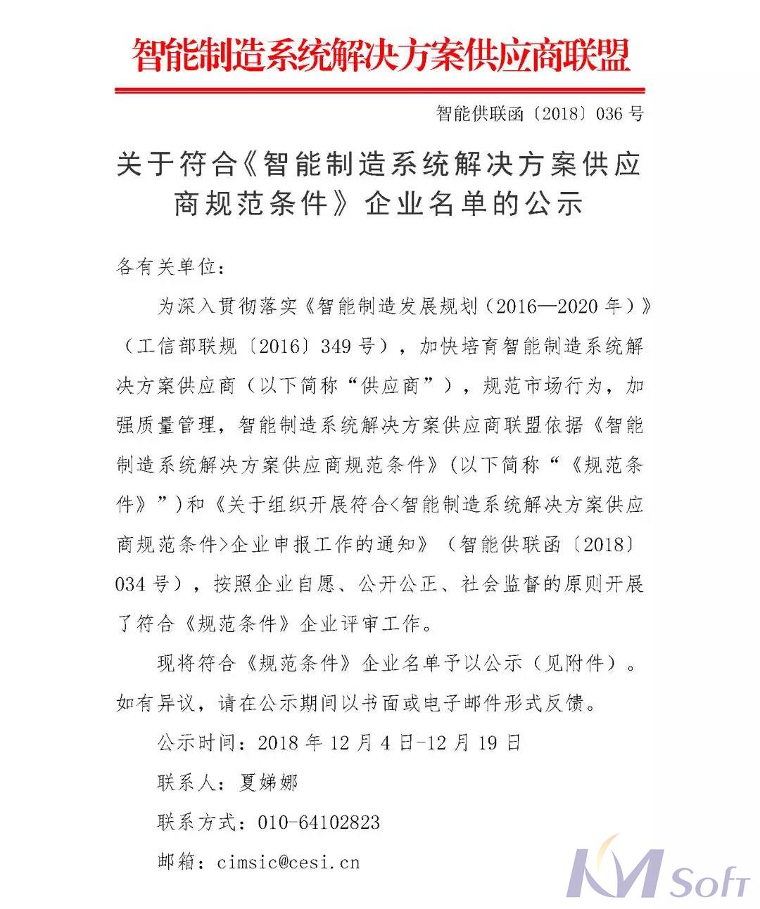 2018年12月4日,由中國智能制造系統(tǒng)解決方案供應(yīng)商聯(lián)盟組織的“符合《智能制造系統(tǒng)解決方案供應(yīng)商規(guī)范條件》企業(yè)”評(píng)選結(jié)果正式出爐,經(jīng)專業(yè)審查,在全國范圍內(nèi)共評(píng)審出82家符合《規(guī)范條件》的企業(yè),武漢開目信息技術(shù)股份有限公司有幸入選其中。