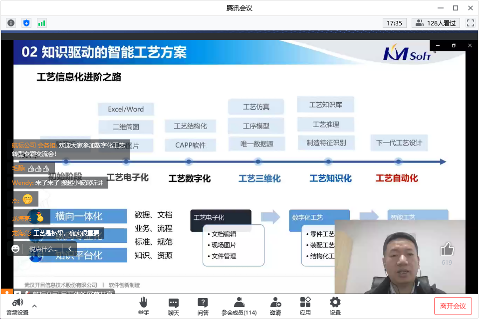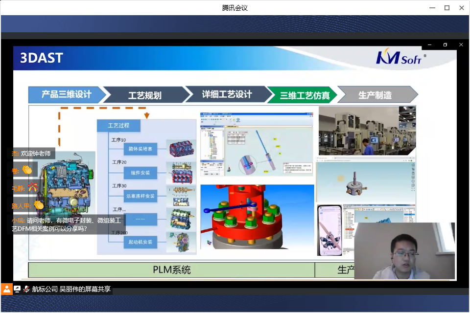 連線研討環(huán)節(jié),參會代表積極參與,踴躍互動:工藝的規(guī)劃和審查規(guī)則是基于什么標(biāo)準(zhǔn)制定,是否支持用戶自定義呢?DFM能否審查二維圖紙,二維與三維的尺寸標(biāo)注如何進(jìn)行審查?開目3DAST模型輕量化能對模型優(yōu)化多少比例,輕量化轉(zhuǎn)換后會不會存在模型數(shù)據(jù)丟失或信息缺失?3DMPS中工藝路線如何生成?如何實(shí)現(xiàn)工藝快速變更呢?工藝流程圖如何形成?三維工藝下車間如何實(shí)現(xiàn)?工藝制造一體化如何實(shí)現(xiàn)?······