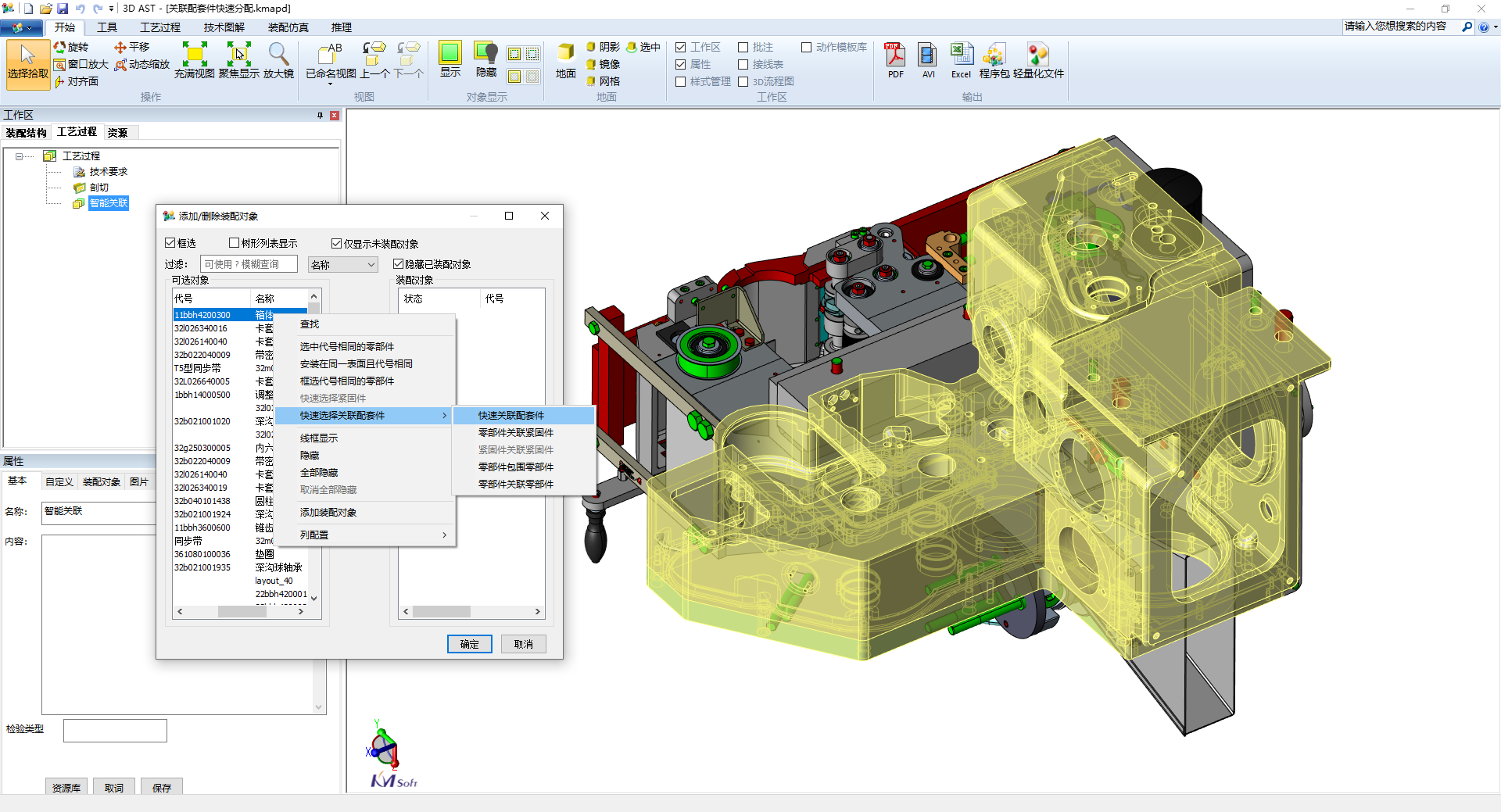 開目3DAST研發(fā)團(tuán)隊通過三維裝配模型零部件特征之間的拓?fù)潢P(guān)系,基于國際、國家及行業(yè)標(biāo)準(zhǔn)和開目在工業(yè)軟件多年的技術(shù)積累,自主研發(fā)了零部件智能關(guān)聯(lián)算法,包括零部件關(guān)聯(lián)緊固件、緊固件關(guān)聯(lián)緊固件、零部件包圍零部件等??梢栽谶x擇某零部件的同時智能推斷出與其有關(guān)聯(lián)關(guān)系的零部件,進(jìn)行一次性添加,實現(xiàn)工序規(guī)劃階段零件的選取效率提升50%以上。