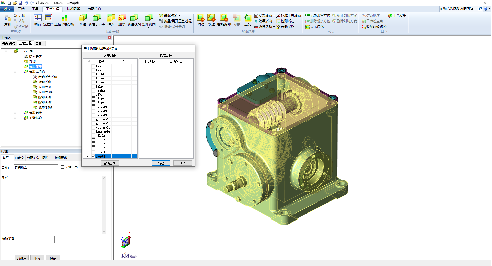 結(jié)合經(jīng)典圖形算法及數(shù)據(jù)結(jié)構(gòu),開目3DAST研發(fā)團(tuán)隊開發(fā)出基于約束的快速定義拆卸活動功能。針對工序進(jìn)行拆卸活動時,對工序的對象進(jìn)行空間位置與接觸關(guān)系的分析,自動推薦該工序零部件的拆卸順序與運動軌跡。如在減速器箱蓋的裝配規(guī)劃中,通過智能拆卸功能可以將軸承蓋、箱蓋及各緊固件進(jìn)行快速規(guī)劃,整體操作效率提升20%以上。