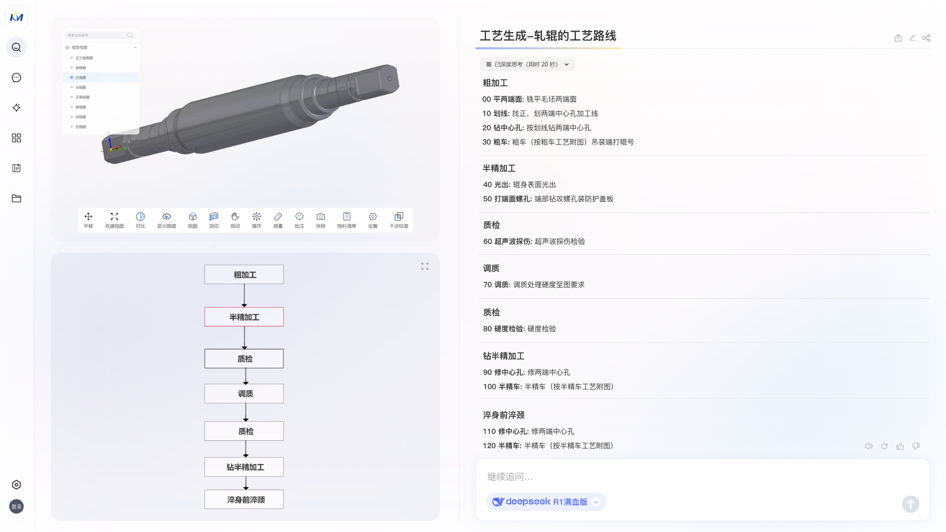研發(fā)數(shù)據(jù)關(guān)聯(lián)解析,提高設(shè)計(jì)工作效率。借助DeepSeek 多源信息融合、特征抽取與轉(zhuǎn)換等能力,KMPLM CLOUD能夠?qū)崿F(xiàn)對(duì)零件的智能分類及動(dòng)態(tài)對(duì)比,并推薦最優(yōu)工藝方案。用戶只需上傳零件圖紙、數(shù)模或設(shè)計(jì)規(guī)格,便能自動(dòng)提取關(guān)鍵信息,與既有數(shù)據(jù)進(jìn)行解析比對(duì),自動(dòng)生成零件分類描述報(bào)告、相似零件/工藝的比對(duì)結(jié)果、推薦優(yōu)化方案。這一應(yīng)用場(chǎng)景已在部分企業(yè)成功試點(diǎn),極大地簡(jiǎn)化了工藝設(shè)計(jì)工作,提高了工作效率。