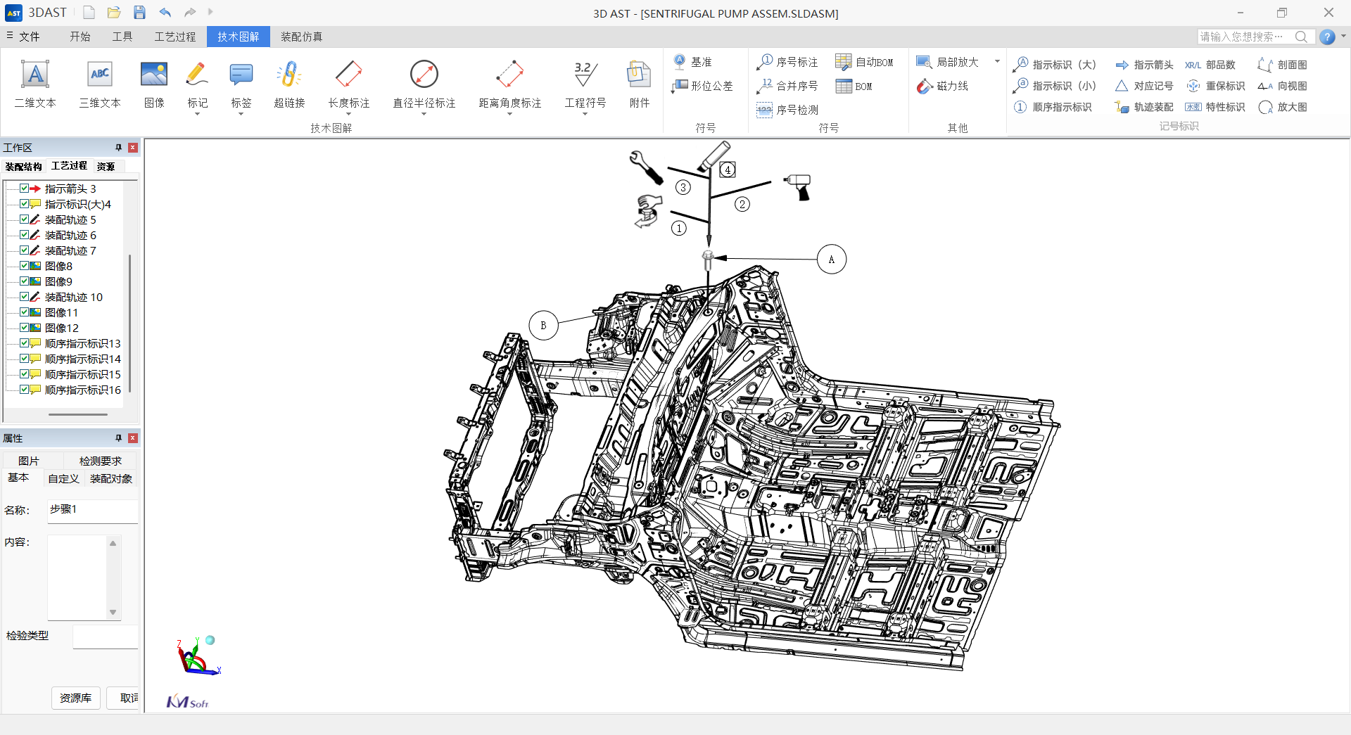 3DAST 18.0利用先進的三維可視化技術,將白車身總裝工藝以生動、直觀的三維圖解形式呈現(xiàn)。用戶可在軟件中對三維白車身模型進行全方位瀏覽、拆解與標注,自由添加總裝記號、圖識等工藝信息,還支持動態(tài)展示裝配流程與關鍵技術要點,將復雜的白車身總裝工藝轉化為直觀易懂的可視化數(shù)字資產(chǎn)。