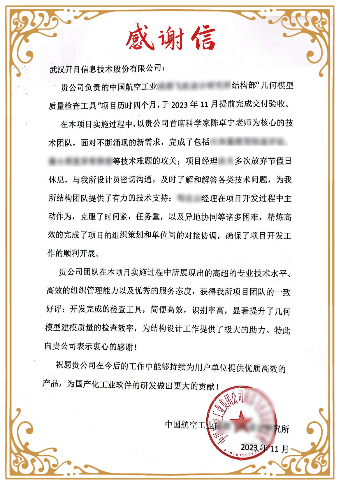 近日,中國(guó)航空工業(yè)集團(tuán)某研究所幾何模型質(zhì)量檢查工具(3DDFM)項(xiàng)目順利驗(yàn)收,項(xiàng)目組僅用4個(gè)月便提前完成了大量艱難的個(gè)性化需求技術(shù)攻關(guān),實(shí)現(xiàn)了批量自動(dòng)化的幾何模型質(zhì)量審查。為此,該研究所向開(kāi)目軟件發(fā)來(lái)感謝信,對(duì)項(xiàng)目團(tuán)隊(duì)的敬業(yè)精神和專(zhuān)業(yè)技術(shù)實(shí)力,表達(dá)了衷心的感謝與夸贊。
