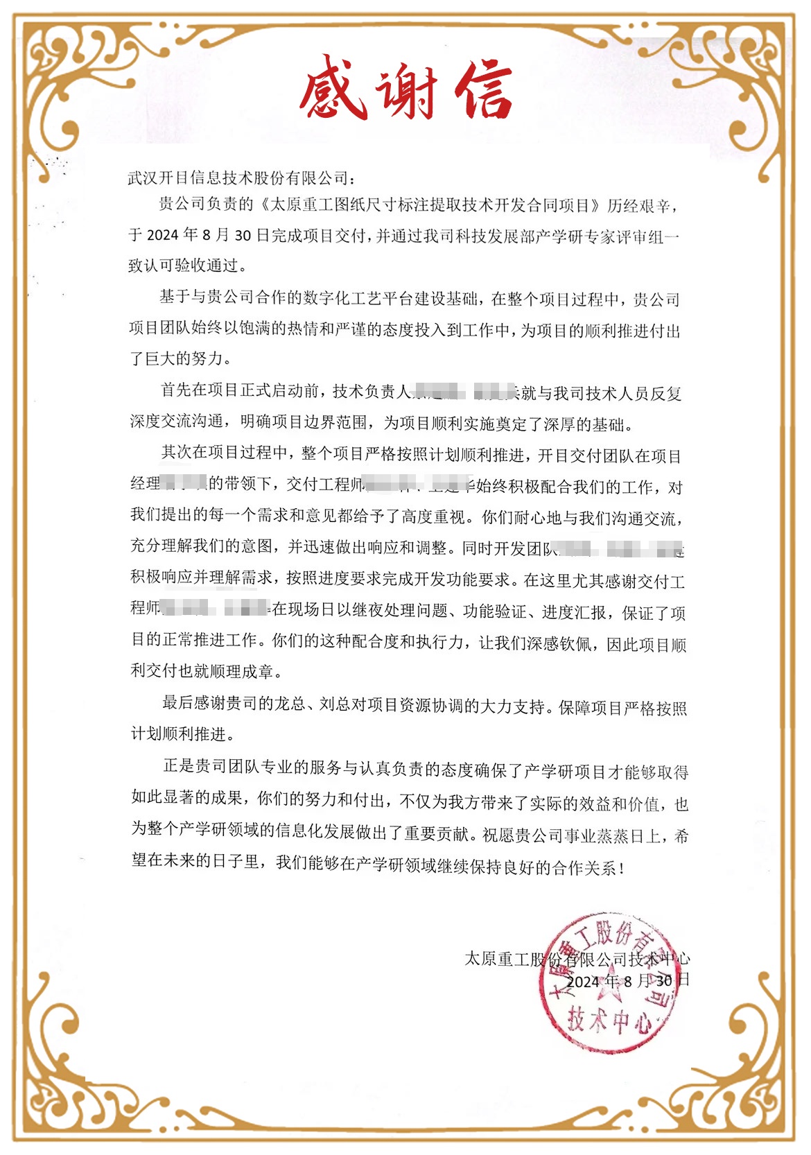 近日,太重集團(tuán)圖紙尺寸標(biāo)注提取技術(shù)開發(fā)項(xiàng)目順利驗(yàn)收,項(xiàng)目組僅用3個(gè)半月便完成了企業(yè)尺寸標(biāo)注提取系統(tǒng)的技術(shù)開發(fā),幫助企業(yè)提高了企業(yè)設(shè)計(jì)效率,縮短工藝文件及工藝技術(shù)準(zhǔn)備周期。為此,太重集團(tuán)向開目軟件發(fā)來(lái)感謝信,字里行間充滿了對(duì)開目提供的工業(yè)軟件技術(shù)、產(chǎn)品、方案與服務(wù)的肯定,同時(shí)對(duì)未來(lái)的合作前景進(jìn)行了新的展望。