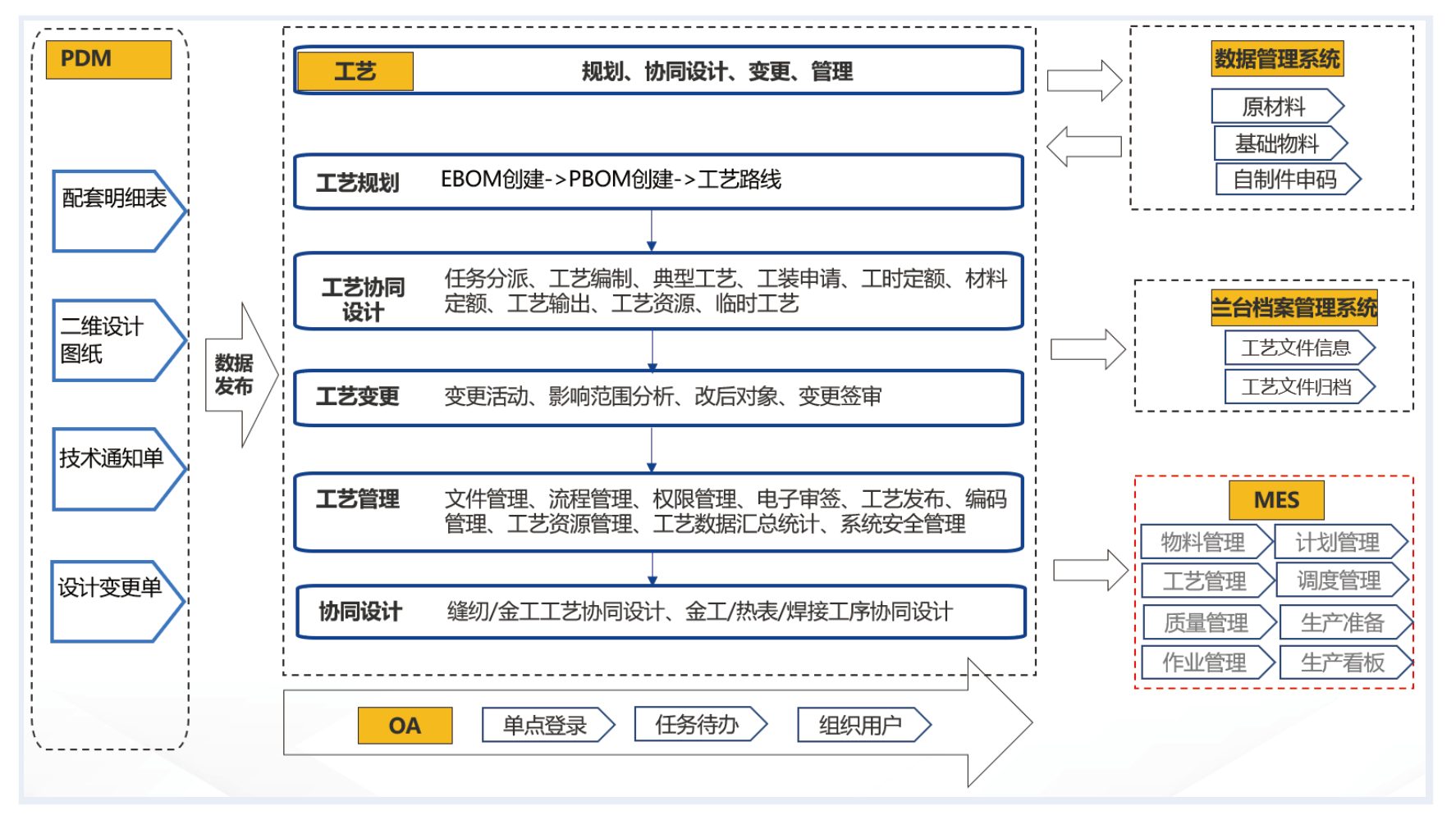 與PDM、OA、數(shù)據(jù)管理系統(tǒng)、檔案管理系統(tǒng)的深度集成,實(shí)現(xiàn)跨部門數(shù)據(jù)流實(shí)時(shí)同步,消除信息孤島,打通從設(shè)計(jì)、工藝到生產(chǎn)的數(shù)據(jù)流,構(gòu)建協(xié)同高效的信息化生態(tài)。